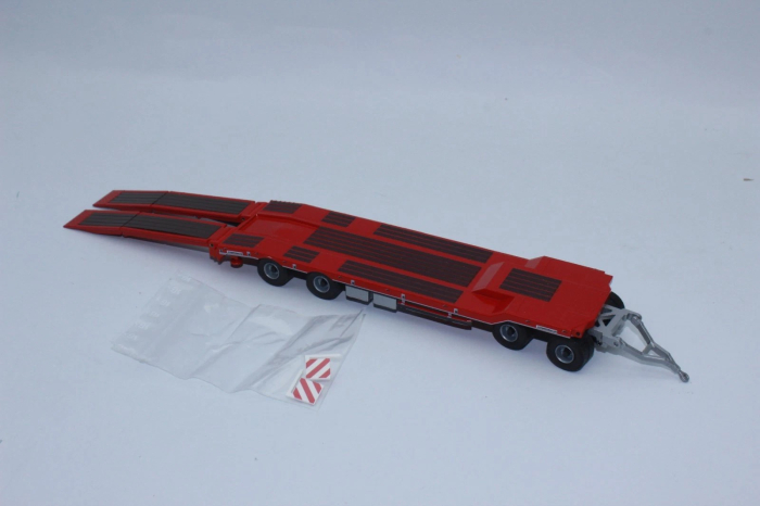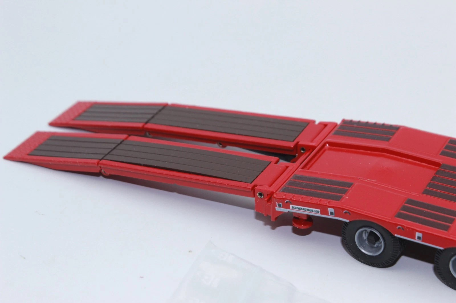 macheta detaliata din metal a unui trailer Scwartzmuller cu 4 axe. Directia este functionala, rampele sunt mobile si are indicatoare de gabarit ce s epot monta pe lateral.
